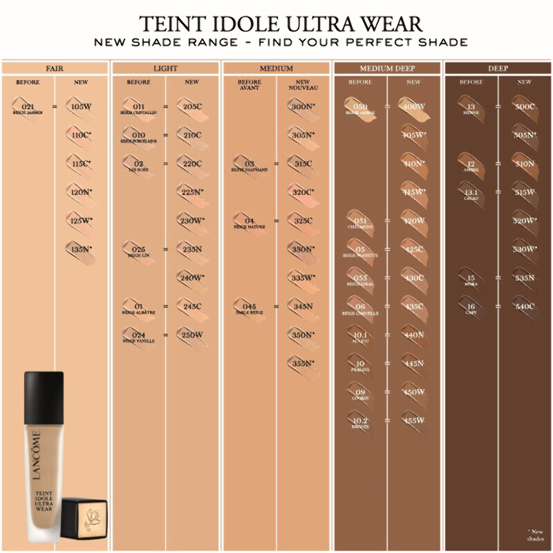 Med vårt nya utbud av nya, vackra nyanser hittar du garanterat din perfekta Teint Idole-match. Skapad med oxidgröna och ultramarinblå pigment för ökad precision av medel och djupa nyanser. Det är slut med grå och askgrå toner på mörk eller olivfärgad hud.